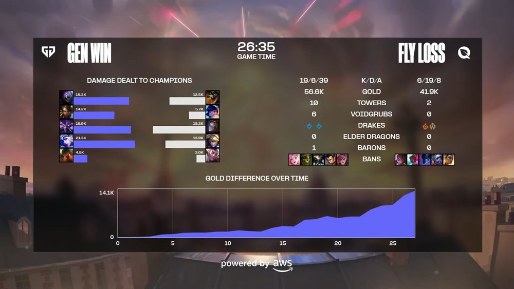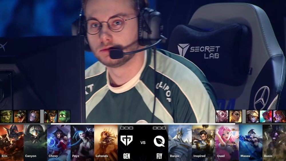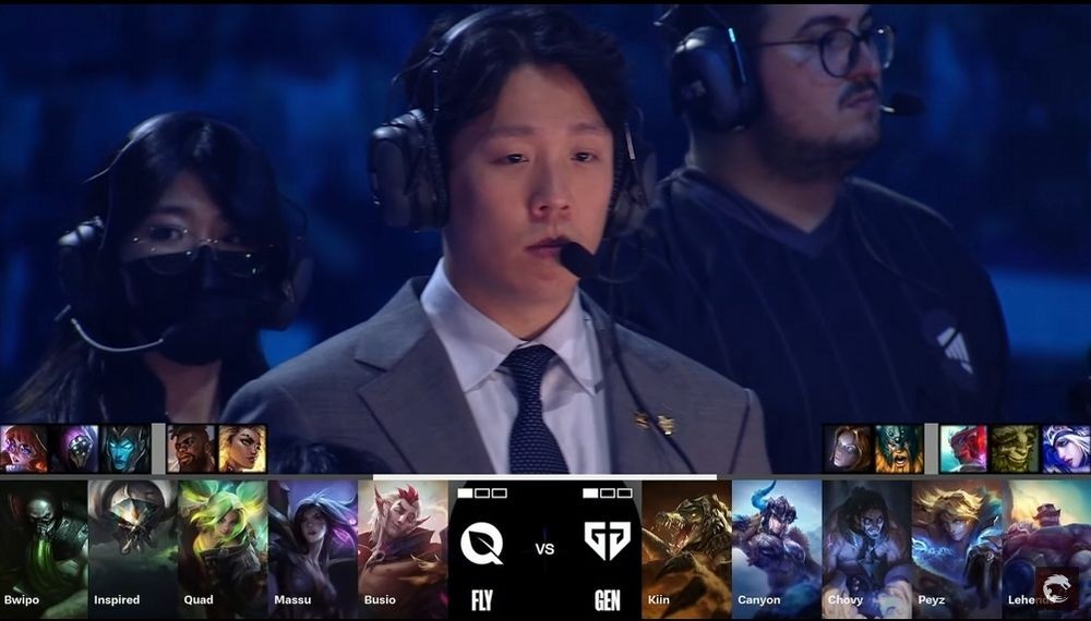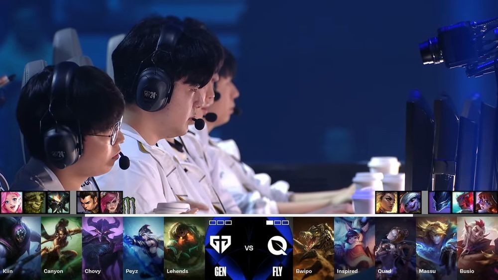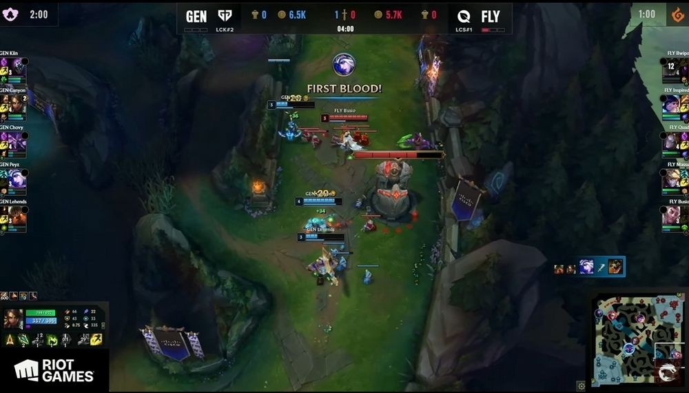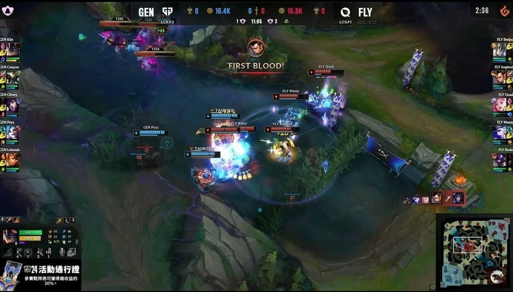 第二场比赛 GEN 拿出比赛少见的卡萨丁应战,FLY 则是选出打野努努。然而前期 GEN 部属塔杀雷尼克顿成功,让贾克斯持续掌握边缐优势,尽管 FLY 积极尝试给予卡萨丁压力,但多次塔杀都因为伤害不足未果,甚至送出击杀与助攻数,让 Chovy 的卡萨丁反而快速拿到两件大装,经济更大幅领先奥莉安娜。26 分钟 GEN 就予以犟势回应,透过快速到位的调整追成 1:1。