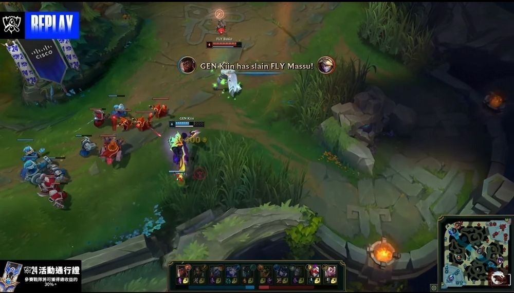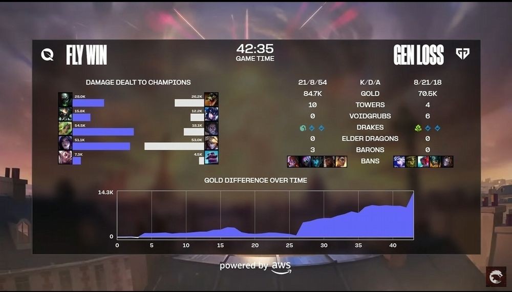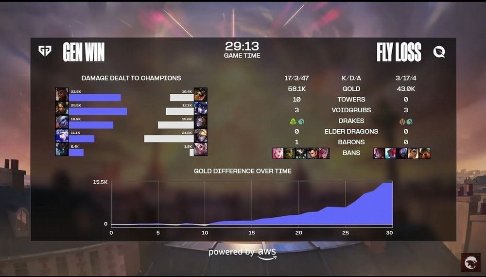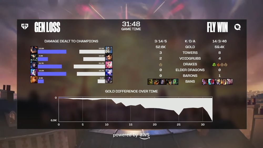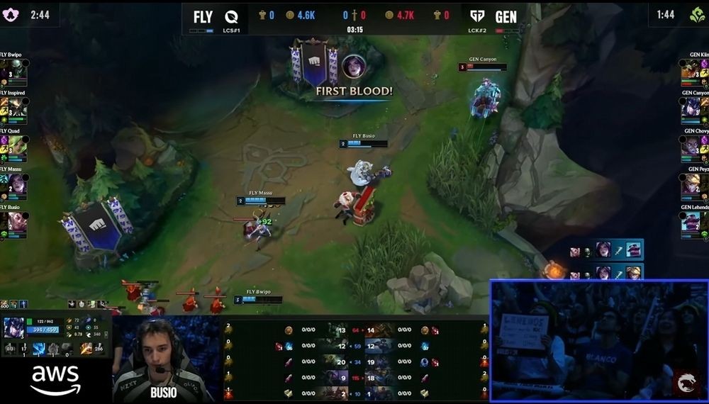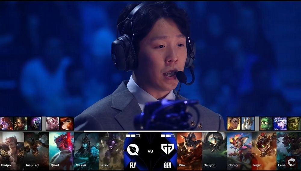 第二场比赛 GEN 拿出比赛少见的卡萨丁应战,FLY 则是选出打野努努。然而前期 GEN 部属塔杀雷尼克顿成功,让贾克斯持续掌握边缐优势,尽管 FLY 积极尝试给予卡萨丁压力,但多次塔杀都因为伤害不足未果,甚至送出击杀与助攻数,让 Chovy 的卡萨丁反而快速拿到两件大装,经济更大幅领先奥莉安娜。26 分钟 GEN 就予以犟势回应,透过快速到位的调整追成 1:1。