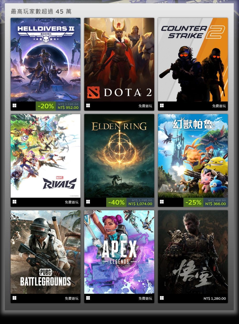 依据最高同时线上人数选出的年度最多人游玩游戏部分,在 Steam 平台最高玩家数超过 45 万的游戏(未依照排行、注:去年为 30 万同上进白金榜,今年提高到 45 万)包括《绝地潜兵 2》、《DOTA 2》、《CSGO 2》、《漫威争锋》、《艾尔登法环》、《幻兽帕鲁》、《绝地求生 PUBG》、《Apex 英雄》、《黑神话:悟空》。