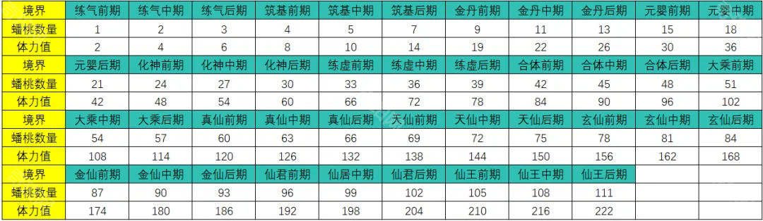 每境界蟠桃以及体力获取具体数值如上表所示!每位道友的境界等级都不一样,运气爆棚的道友境界等级会很高,甚至高于很多氪金的!而运气贼差的道友即使氪金可能境界也会比较低!