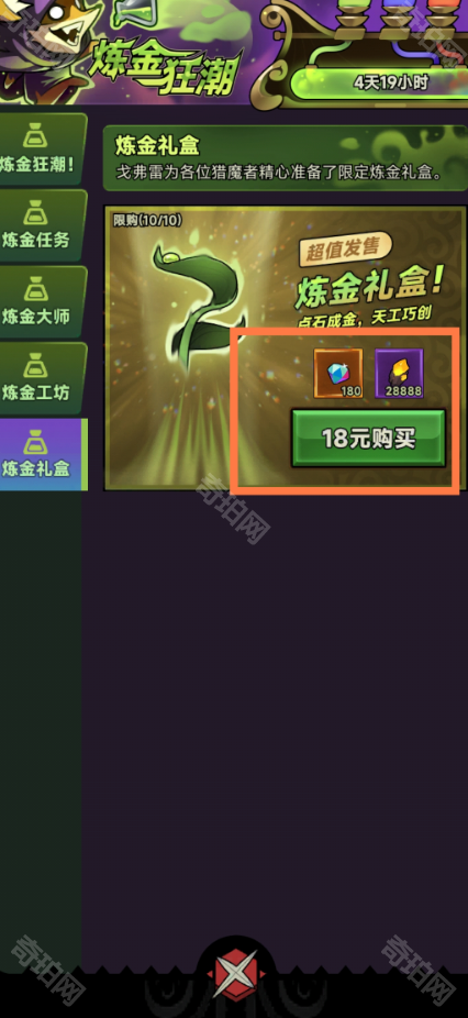 如果觉得炼金石获取速度跟不上,可以考虑购买炼金礼盒。购买后不仅有正常比例的钻石,还额外赠送炼金石!有能力的玩家建议买满,大致可以满足行宫天赋所需资源。