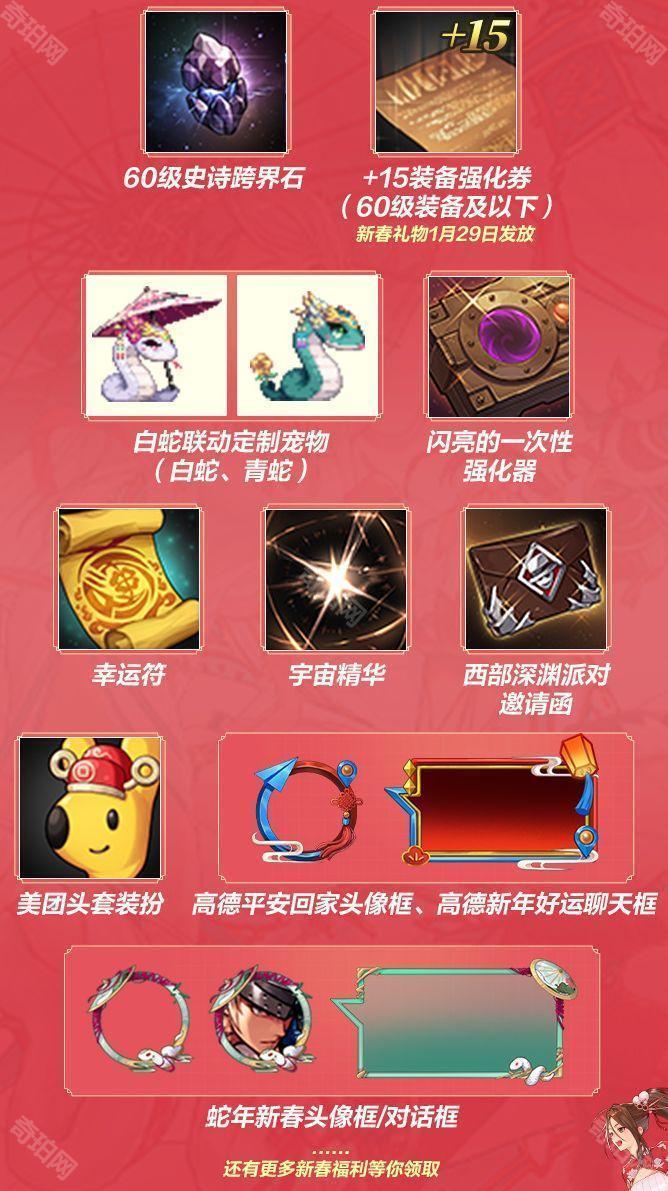 60级史诗跨界石、+15装备强化券(60级及以下)、白蛇联动定制宠物、幸运符、宇宙精华、蛇年新春头像框/聊天框等奖励