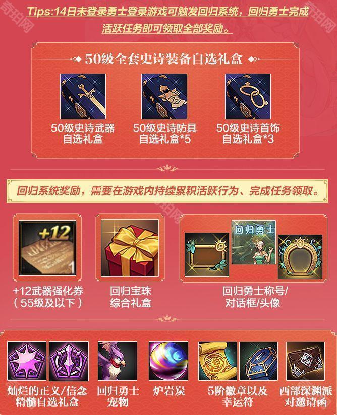 完成回归任务可以获得+12强化史诗武器、+10强化全身史诗等奖励