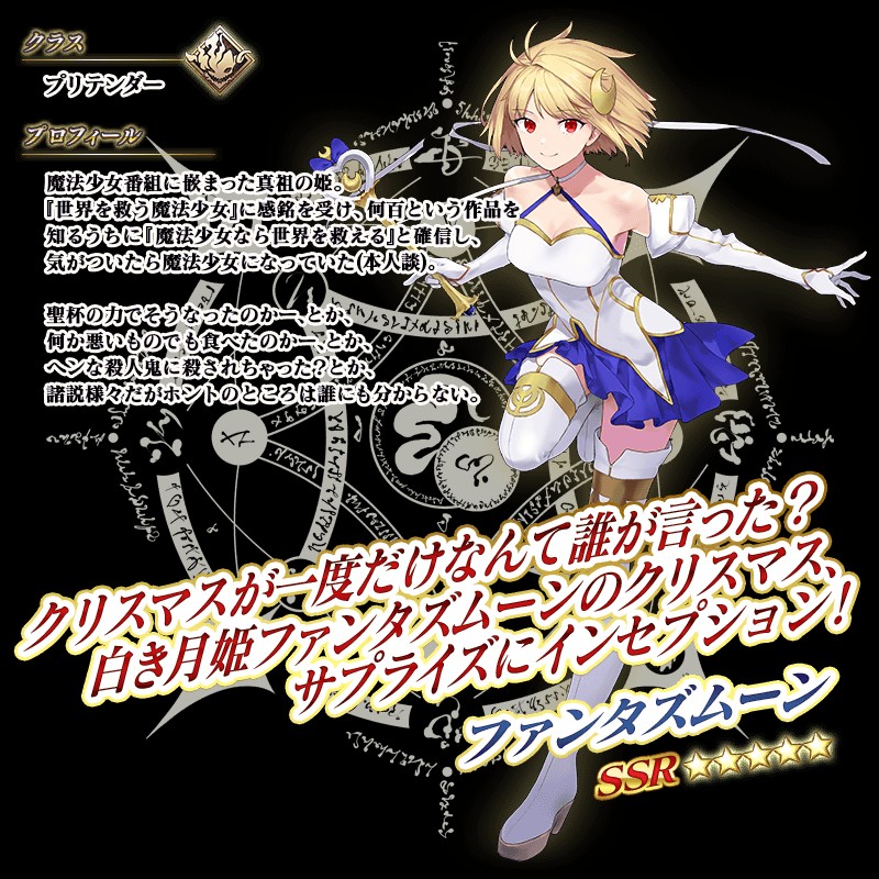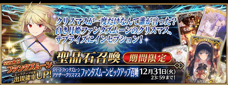 本次期间限定活动「太空・幻想之月 另一个圣诞节 深夜中的幻想问候」举办期间,也推出期间限定召唤卡池「太空・幻想之月 另一个圣诞节 幻想之月 PICK UP 召唤」。卡池中有首次登场的五星从者「幻想之月」以及全新概念礼装。