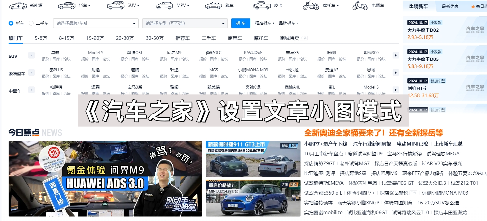 汽车之家怎么设置文章小图模式?汽车之家是一款可以查看汽车资讯以及预约汽车试驾的软件,很多小伙伴很喜欢使用汽车之家来浏览一些汽车资讯,这样就需要使用小图模式方便自己的浏览,很多小伙伴不知道怎么设置,那么具体的接下来就跟着小编一起来了解一下《汽车之家》设置文章小图模式。