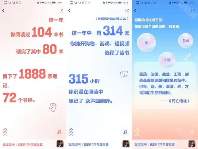 3、微信读书也会提供年度报告,我们可以看到自己的读书时间和书籍数量等数据