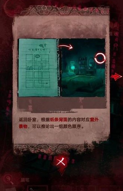 9、大家回到卧房,依据纸条反面内容对应窗外景色,即可领取一组颜色次序。