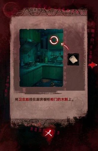 26、大家获得纸巾后前往厨房,将纸巾放在厨房上的橱柜柜门木刺上。