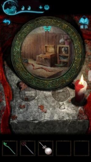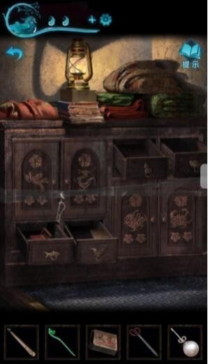 9、大家开启岩洞中刚刚房间,进来先翻木柜,即可得到一个珍珠耳环,再用手链将胶布扯开,即可得到佛像及其焟烛。