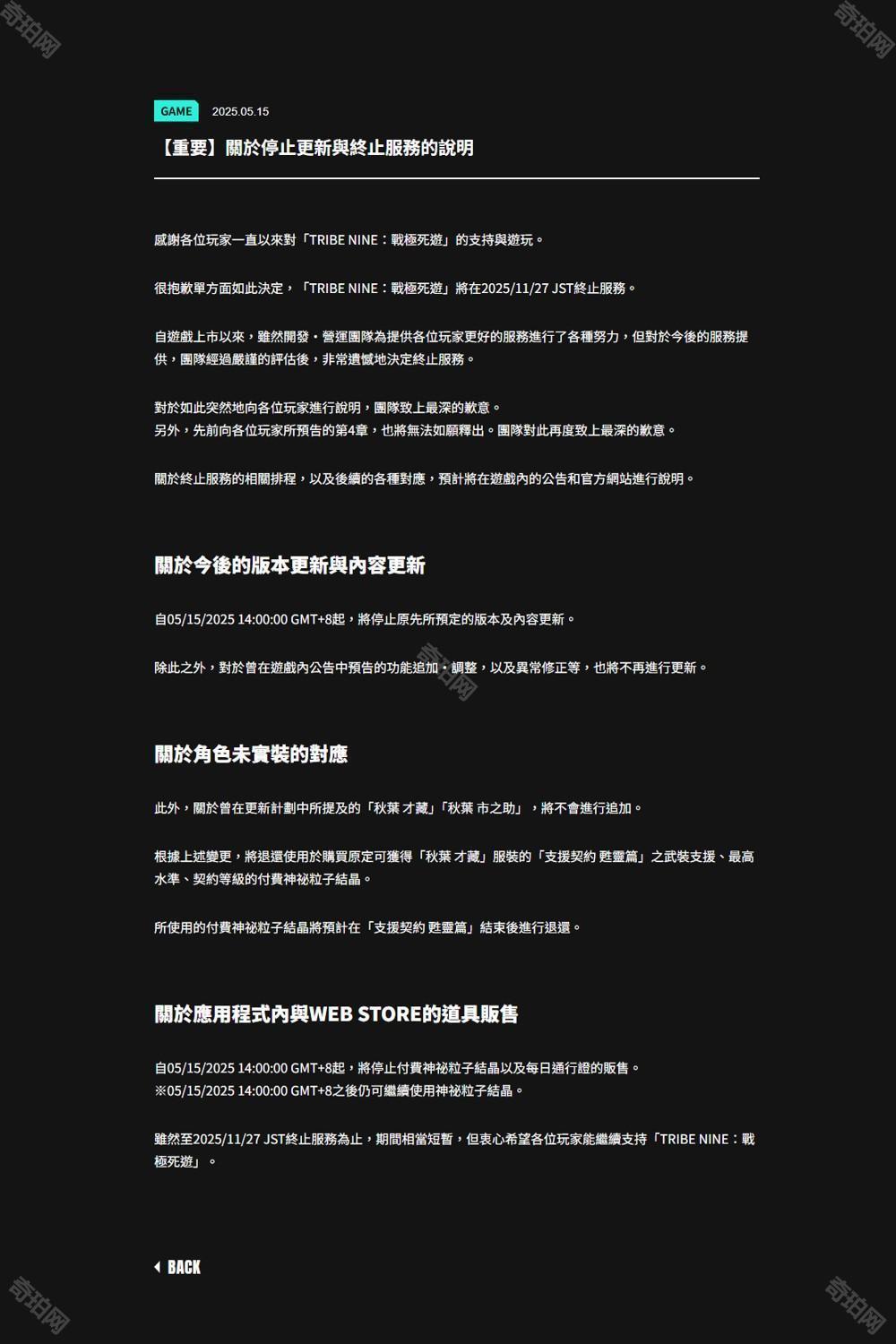 官网关服公告查看地址:https://tribenine.tokyo/zh-hant/news/250515/