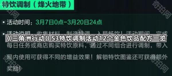 三角洲行动S3特饮调制活动金色饮品配方有哪些?游戏三角洲行动将在3月7日零点开启S3赛季的特饮调制活动,活动期间我们需要收集材料并按照指定配方合成金色饮品来解锁配方。那么接下来就由七珀小编给大家带来《三角洲行动》S3特饮调制活动12个金色饮品配方一览吧。