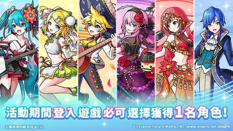 登入游戏,即可从合作角色「初音未来」、「镜音铃」、「镜音连」、「巡音流歌」、「MEIKO」及「KAITO」中,自选获得其中 1 名角色