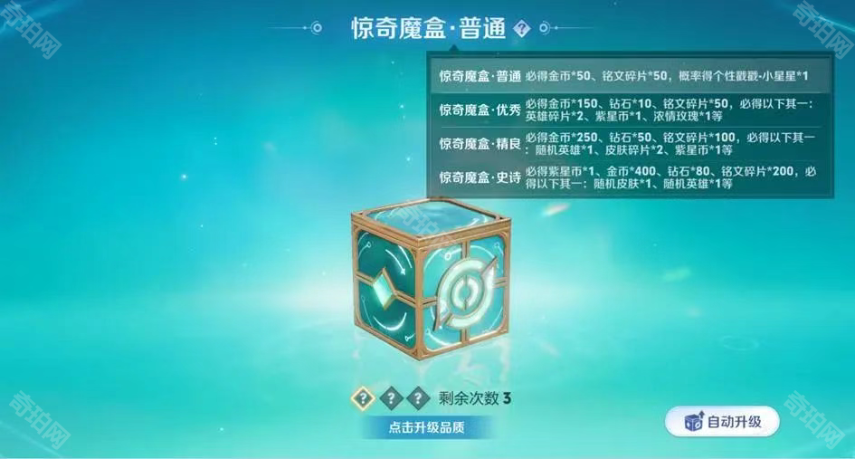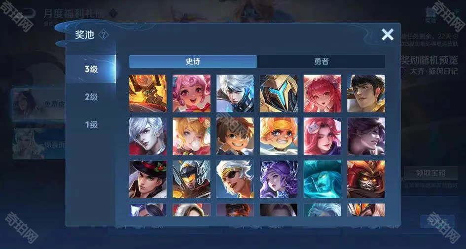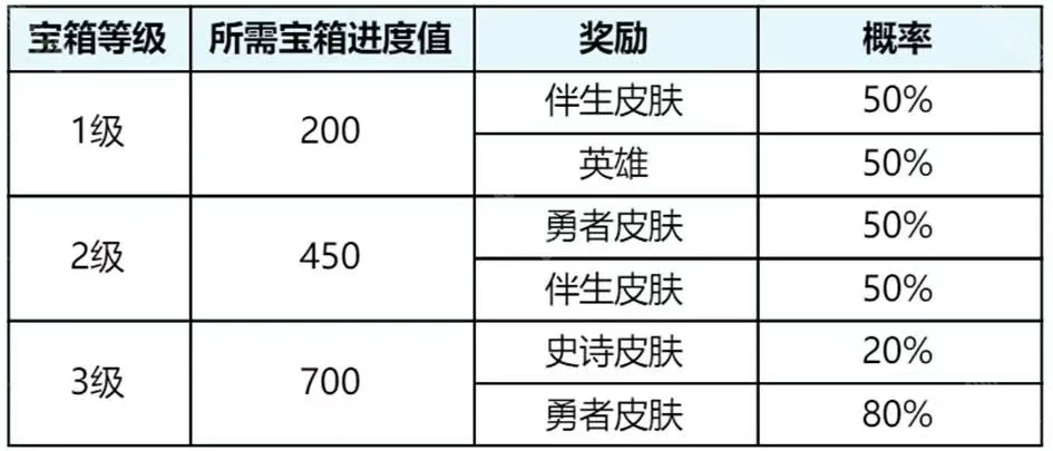 玩家通过完成每日任务获得宝箱升级进度和惊奇魔盒,而宝箱分为三个等级,1级宝箱有50%的概率开出永久英雄,3级宝箱有20%的概率开出史诗皮肤(三个月保底必出史诗)。