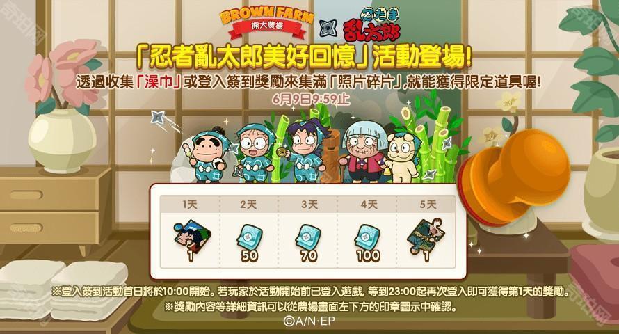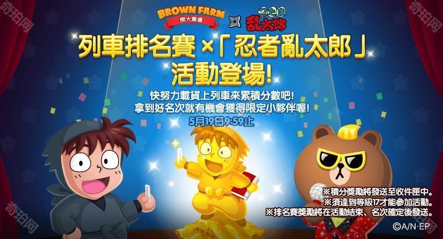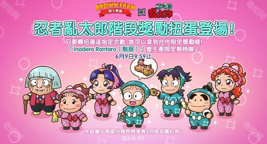农场手游《LINE 熊大农场》与「忍者乱太郎」于 5 月 8 日(四)开始进行合作,这次合作中,忍者乱太郎里的「Inadera Rantaro」、「Settsu no Kirimaru」、「Fukutomi Shinbei」等人气角色来到熊大农场玩耍。合作期间除了在游戏内推出各种限定小伙伴与各式各样的原创装饰之外,还有列车排名赛等活动,玩家可以在这些活动中获得合作限定奖励。