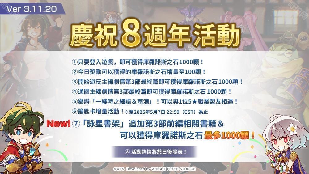 至 2025 年 5 月 31 日 22:59(CST)为止,开始游玩和通关主线剧情第 3 部最终篇时,可以分别获得库罗诺斯之石 1,000 颗(合计 2,000 颗)的活动现正举办中。