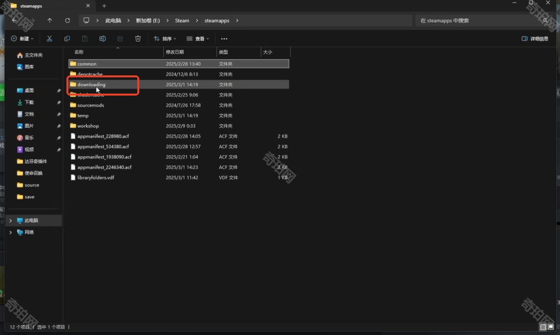 4、我们查看文件管理器上方的文件路径,进入steamapps这个文件夹,点击downloading文件夹