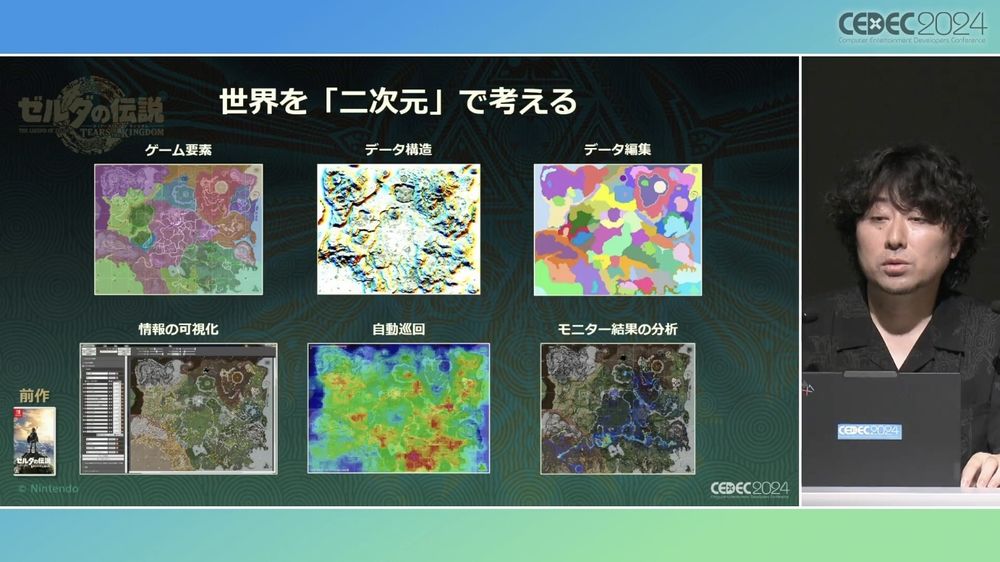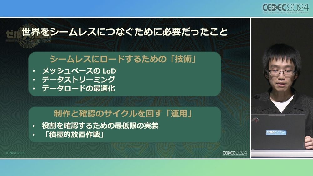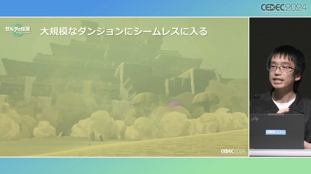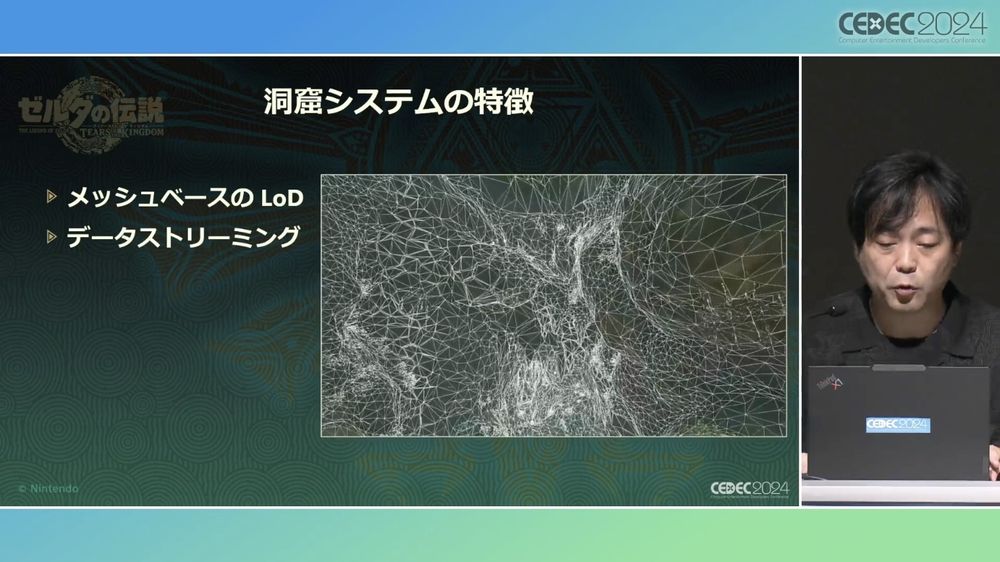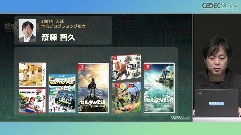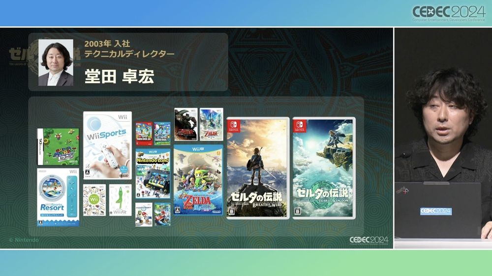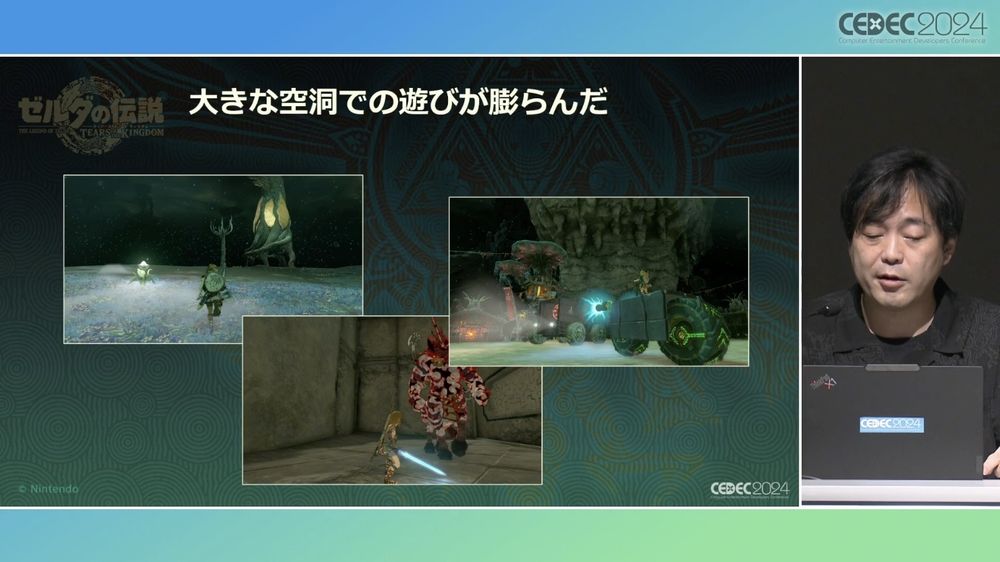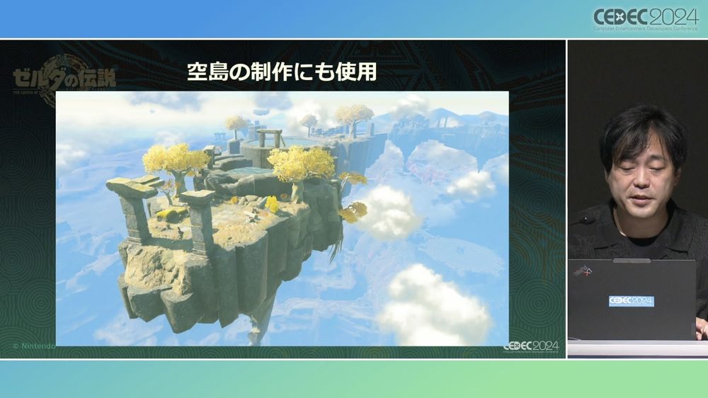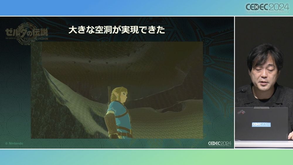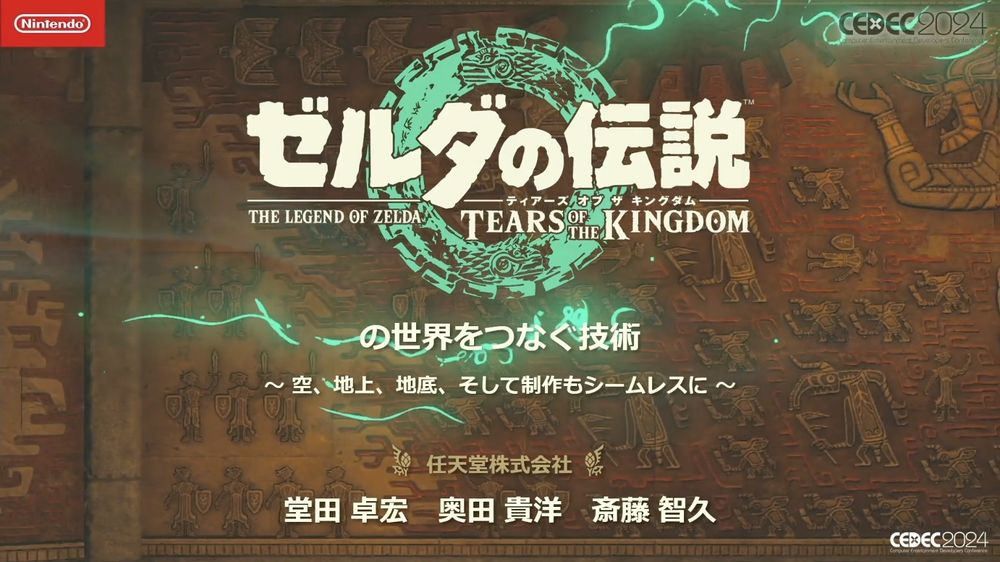 在 2024 年针对游戏开发者所举办的论坛「CEDEC 2024」里,举行了讲座「把《萨尔达传说 王国之泪》」的世界串连起来的技术 ~将天空、地面、地底以及制作都带入无缝的领域~」。