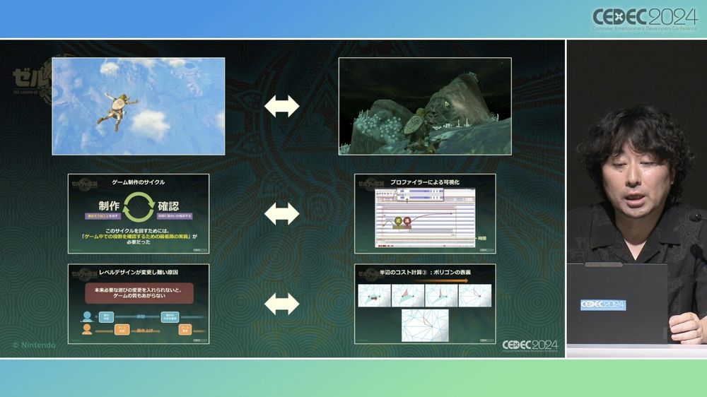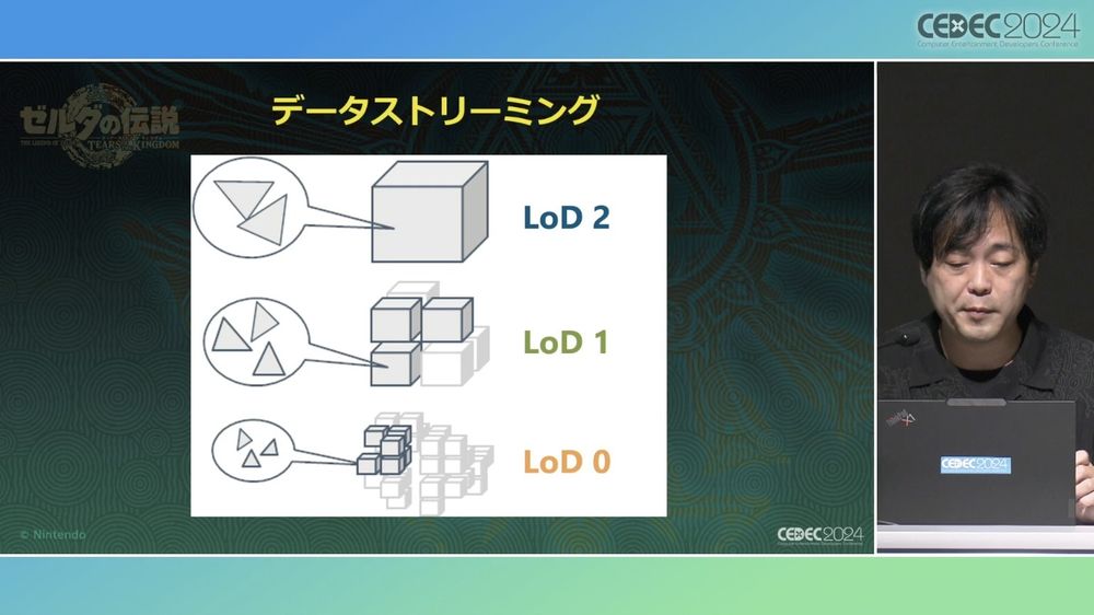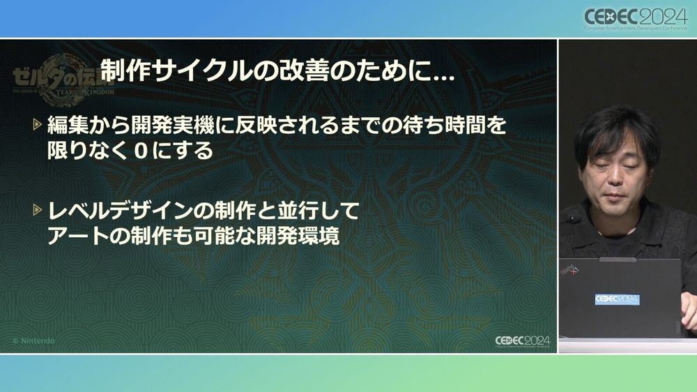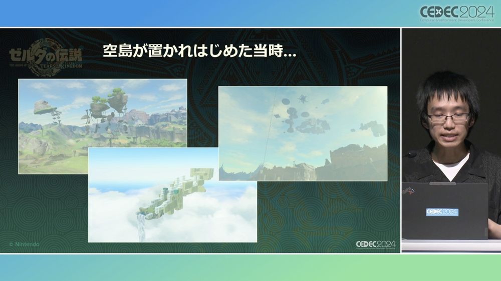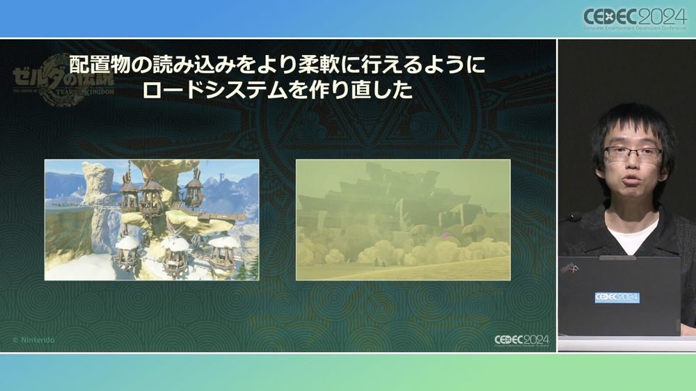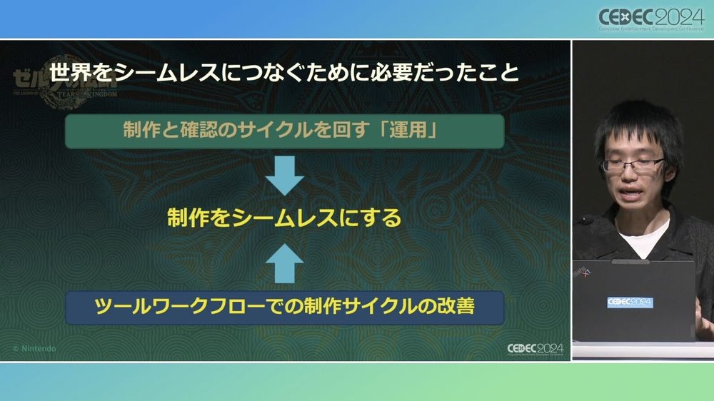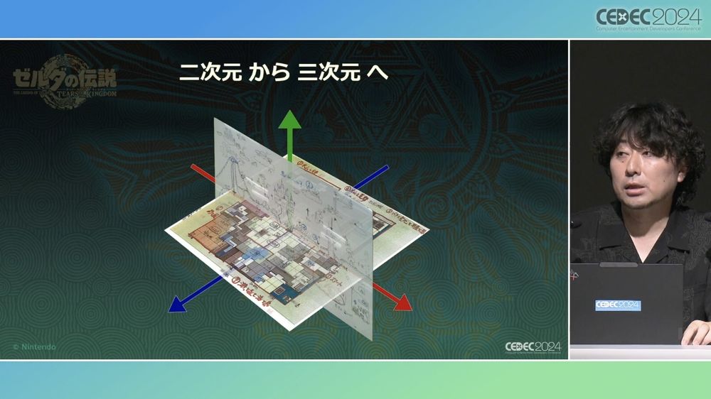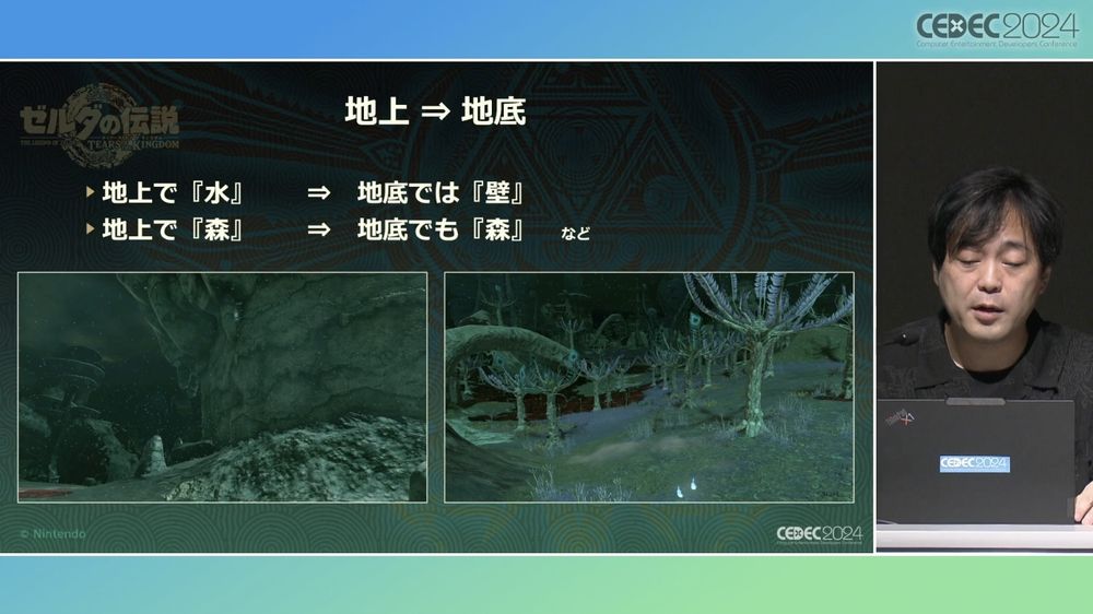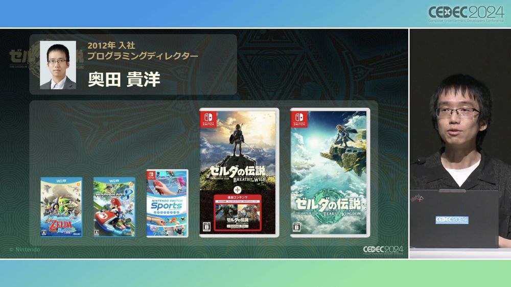 在 2024 年针对游戏开发者所举办的论坛「CEDEC 2024」里,举行了讲座「把《萨尔达传说 王国之泪》」的世界串连起来的技术 ~将天空、地面、地底以及制作都带入无缝的领域~」。