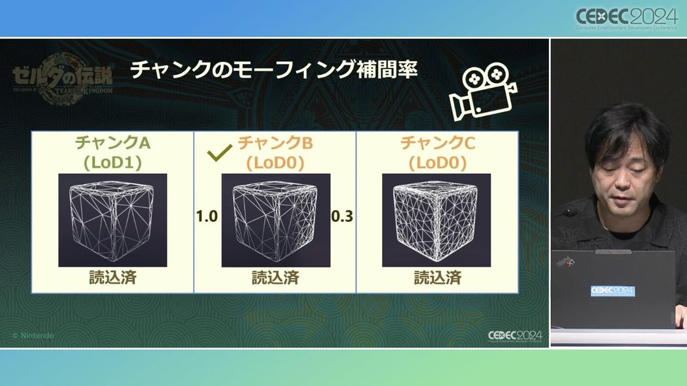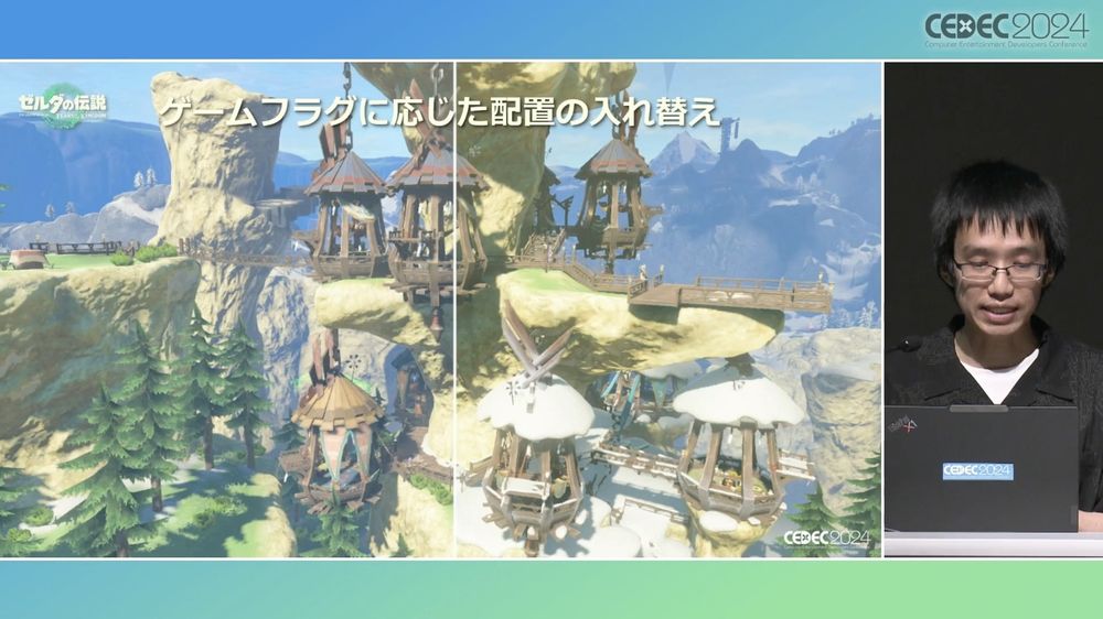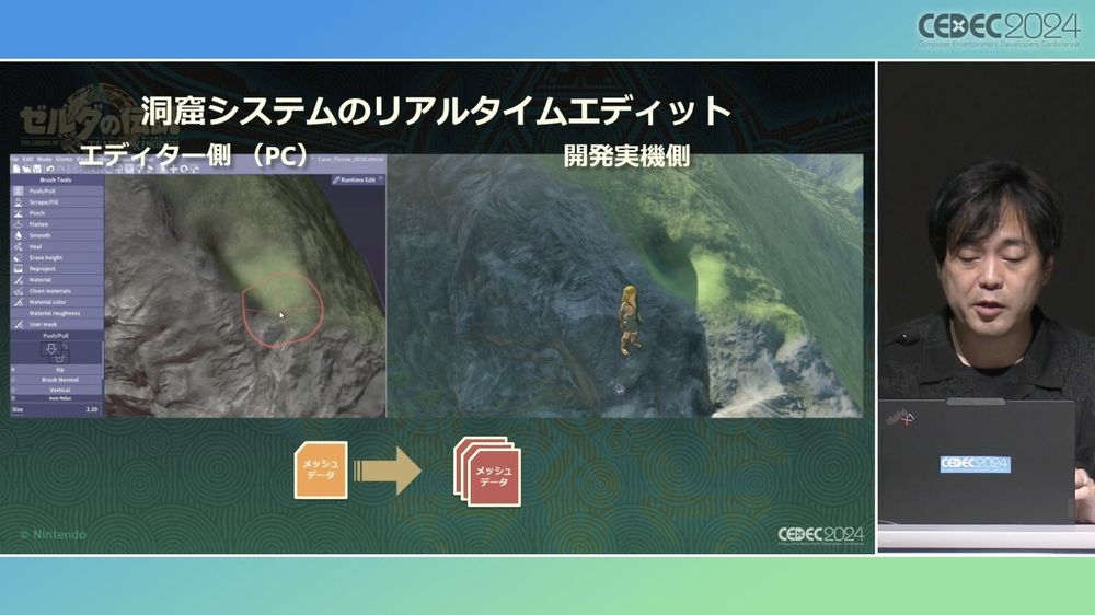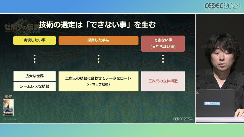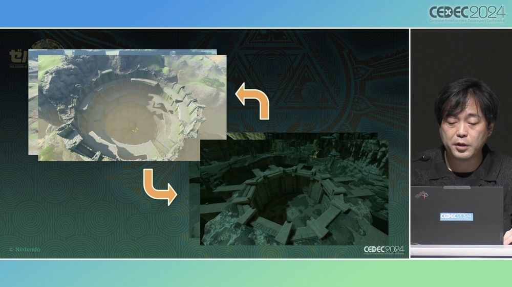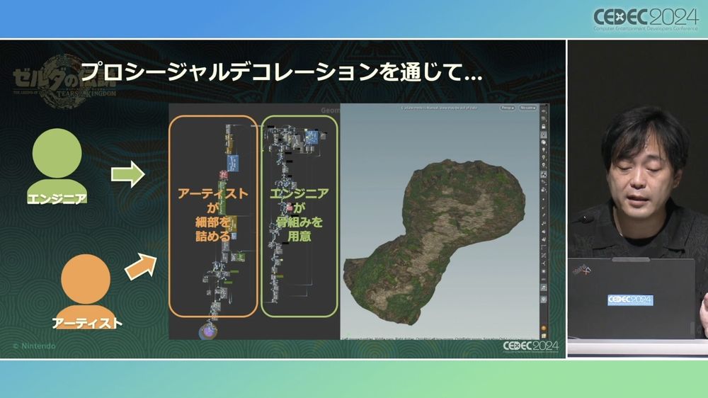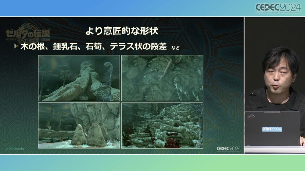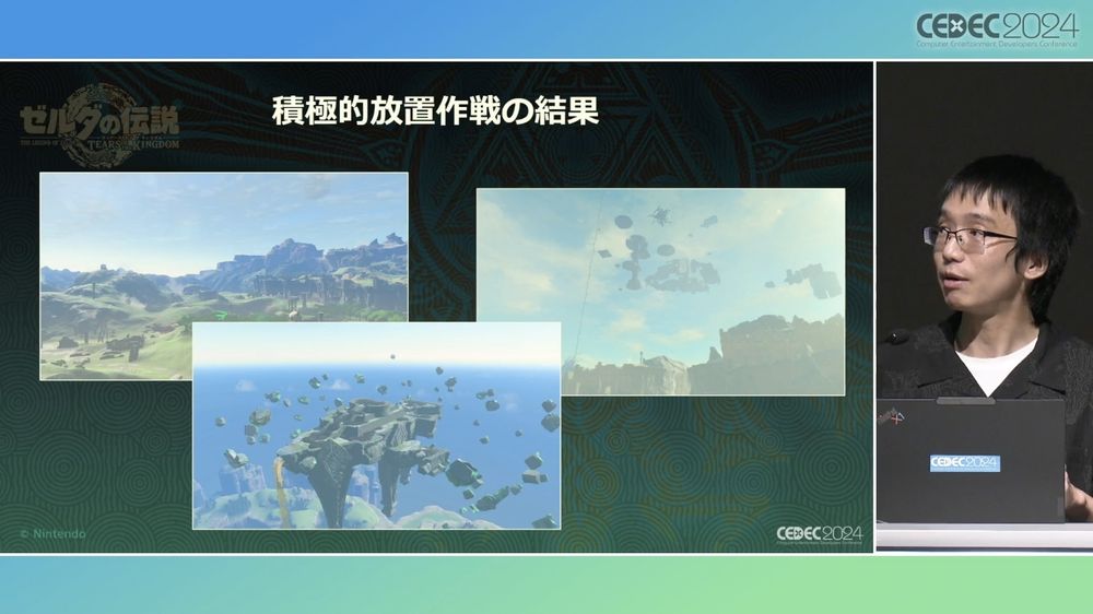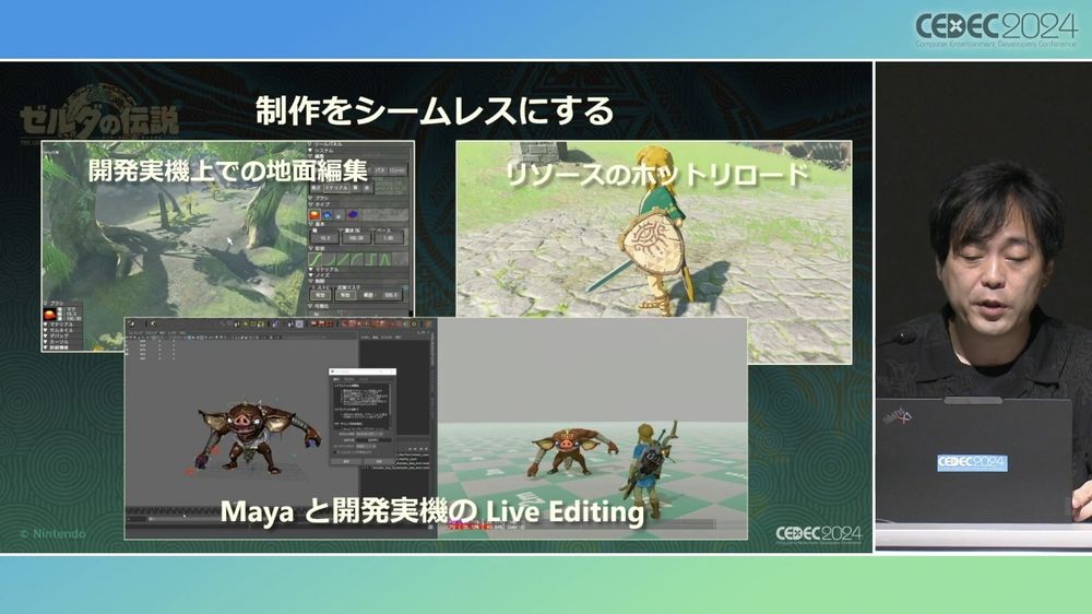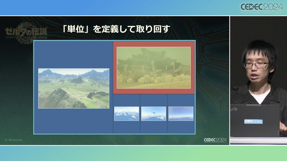 在 2024 年针对游戏开发者所举办的论坛「CEDEC 2024」里,举行了讲座「把《萨尔达传说 王国之泪》」的世界串连起来的技术 ~将天空、地面、地底以及制作都带入无缝的领域~」。