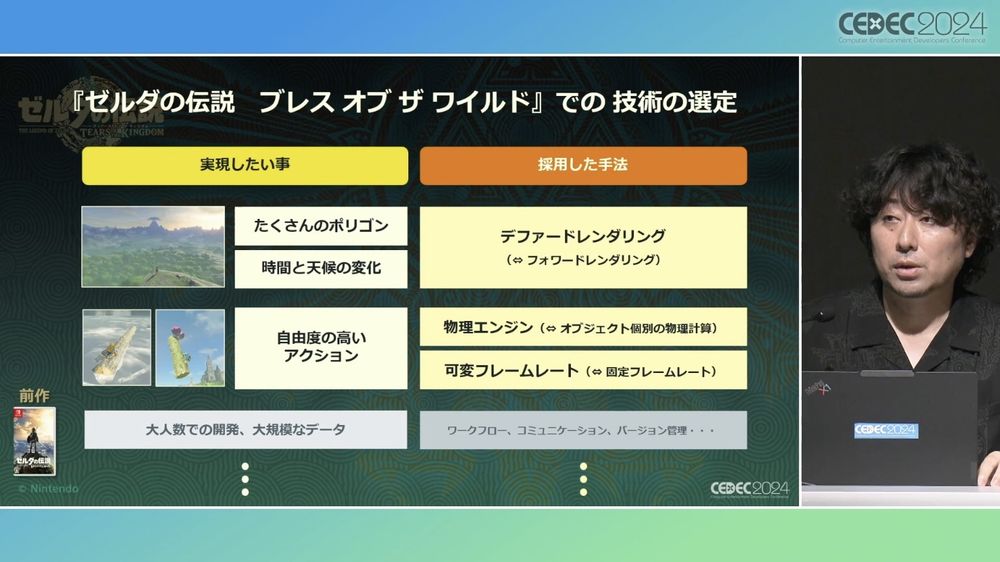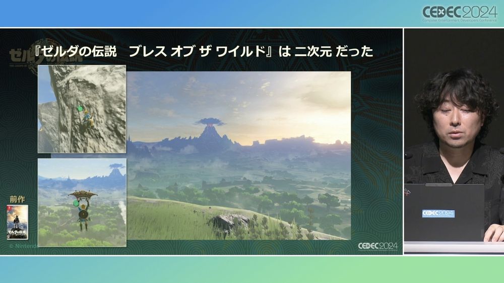 在讲座一开始时,作为介绍开发《萨尔达传说 王国之泪》(以下简称《王国之泪》)所採用技术的前提,制作团队首先解说了有关于前作《萨尔达传说 旷野之息》(以下简称《旷野之息》)的开发过程。