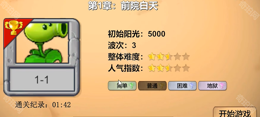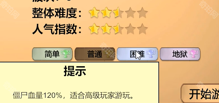 在游戏开始前可以选择难度,难度会影响僵尸的血量和旁白的帮助效果