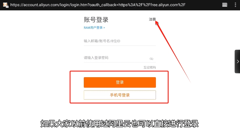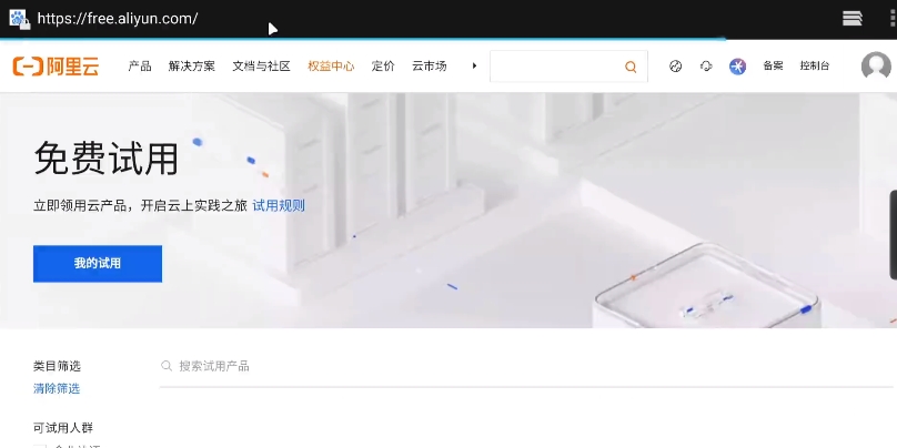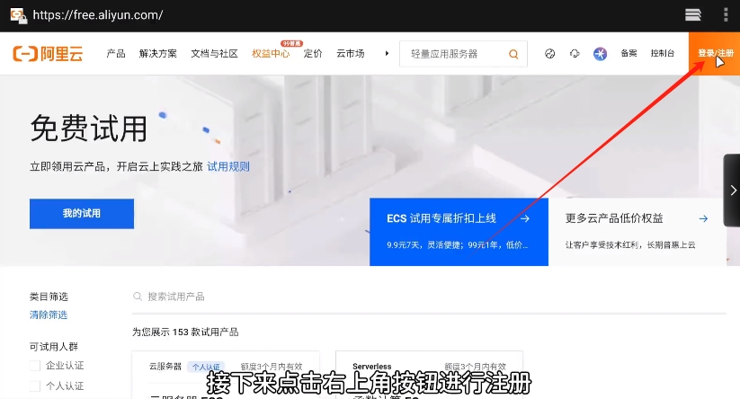 2、接下来点击右上角按钮进行注册,如果大家以前使用过阿里云,也可以直接进行登录。登录完毕后回到这个界面,然后往下翻找。