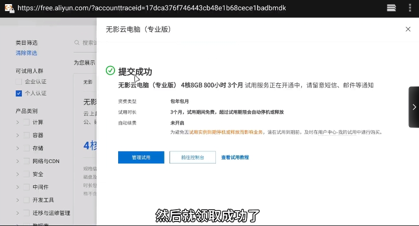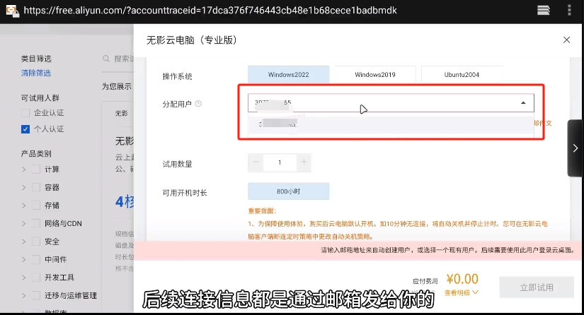 6、可以看到一分钱不用就能白嫖三个月且800小时的云电脑。点击立即试用,然后就领取成功了。