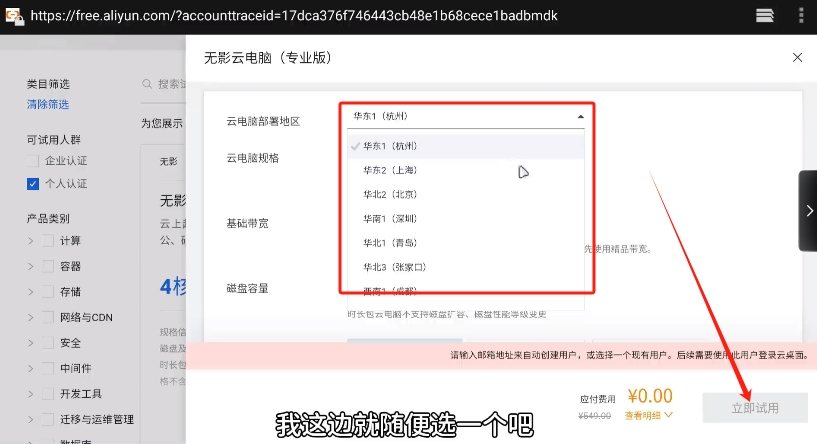 4、点击试用按钮,试用后可获得800小时的时长。附属区域选择距离自己近的,我这边就随便选一个。