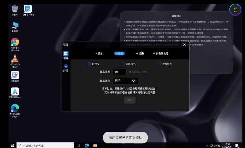 11、上面的悬浮窗是云电脑的基本菜单,可根据喜好自行调整缩放比例与分辨率。