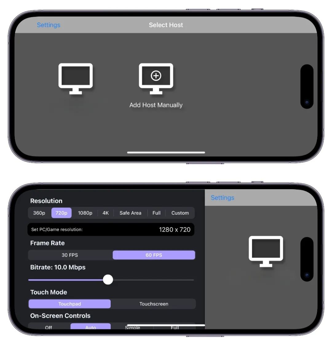 3、在iOS上打开Moonlight,连接到电脑上,这个时候显示的画面是有很多控制键。