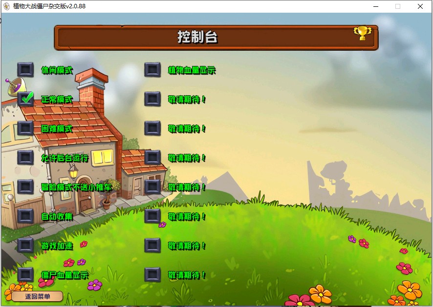 2、点击选项-勾选全屏,游戏难度模式可以在右下方位置进入控制台,包括僵尸血量显示、植物血量显示、自动收集、游戏加速、不送小推车等等功能。