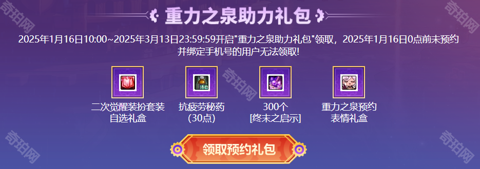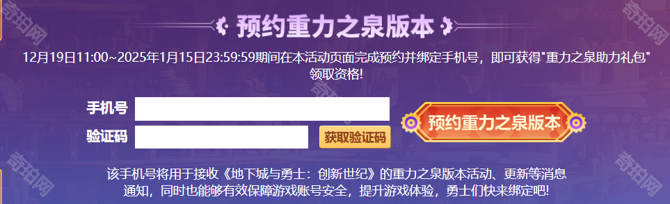 在活动页面完成预约并绑定手机号,即可获得"重力之泉助力礼包"领取资格