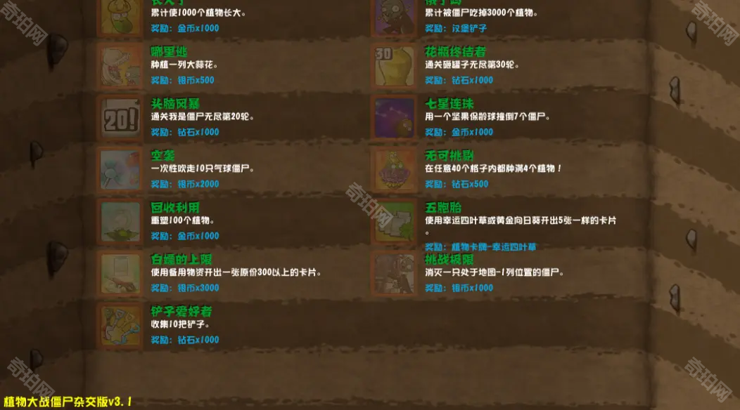 全新的成就系统,达成成就后可以获得银币、钻石和植物卡牌等奖励。
