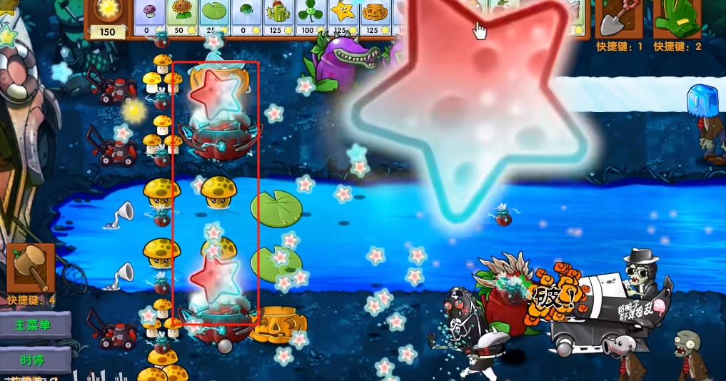 每隔一段时间可以生成一个大星星,向僵尸方向落下,变成几十颗星星攻击。