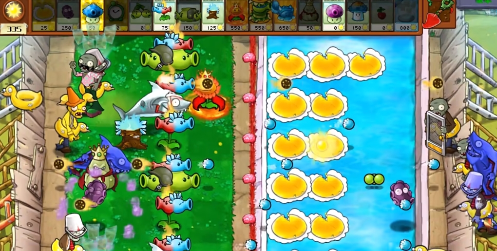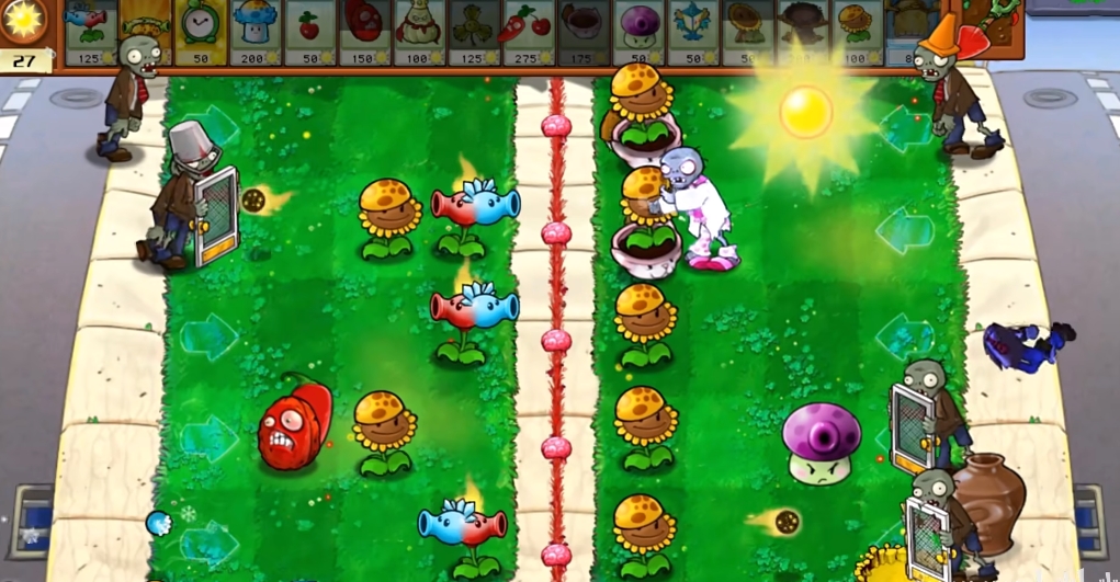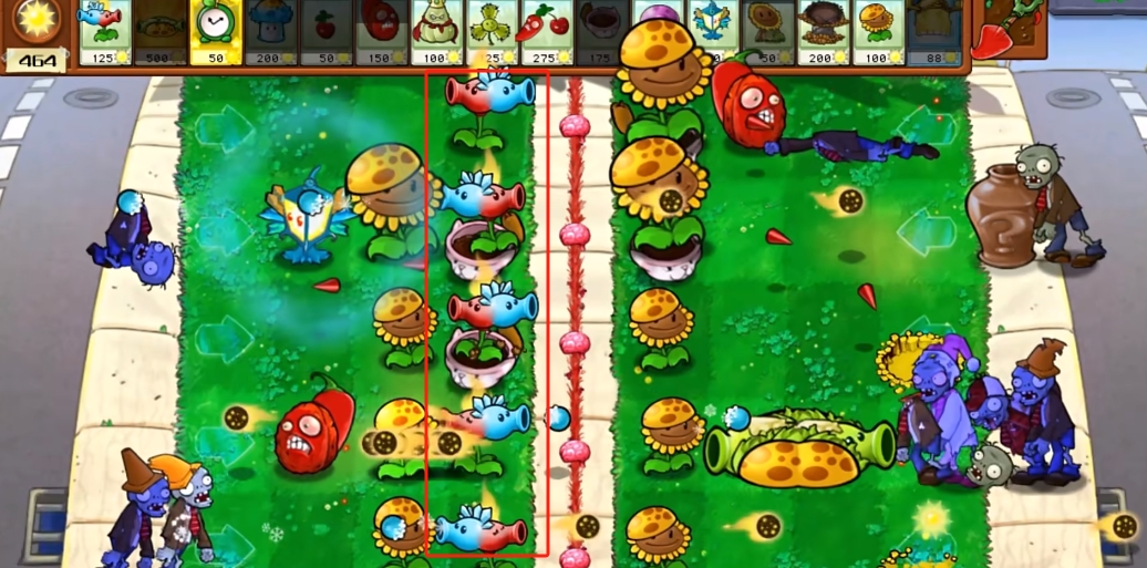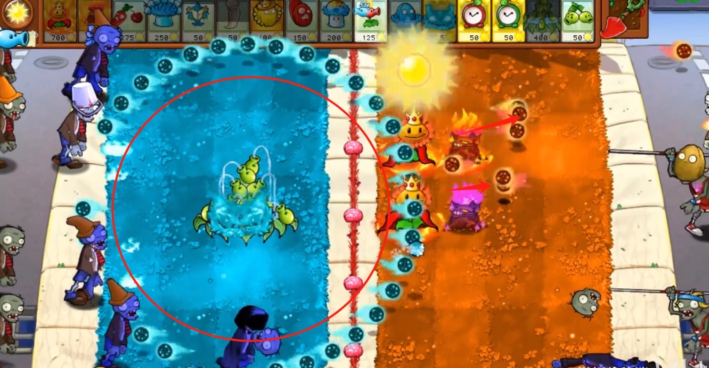 冰火裂荚射手会两头发射子弹,两边都有僵尸来攻击,我们可以根据情况让植物转向攻击。