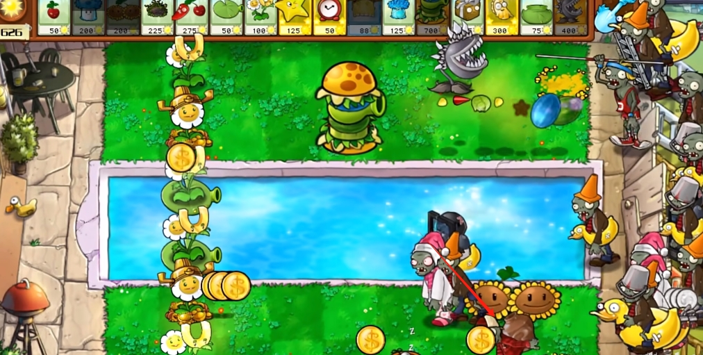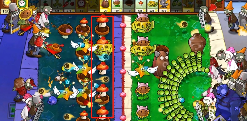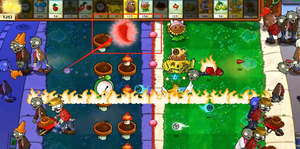 ②低矮植物+火焰植物,不会被僵尸索敌,种在上面的植物免疫减速与冻结。