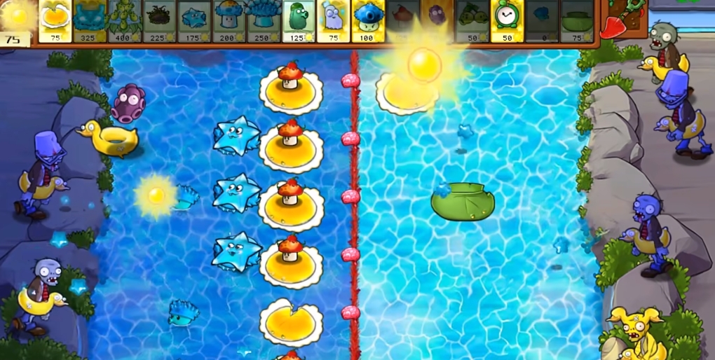 3、难度比起普通的模式高了一点,种植植物的草地范围没有变化,但是两面都开始有僵尸开始夹击。