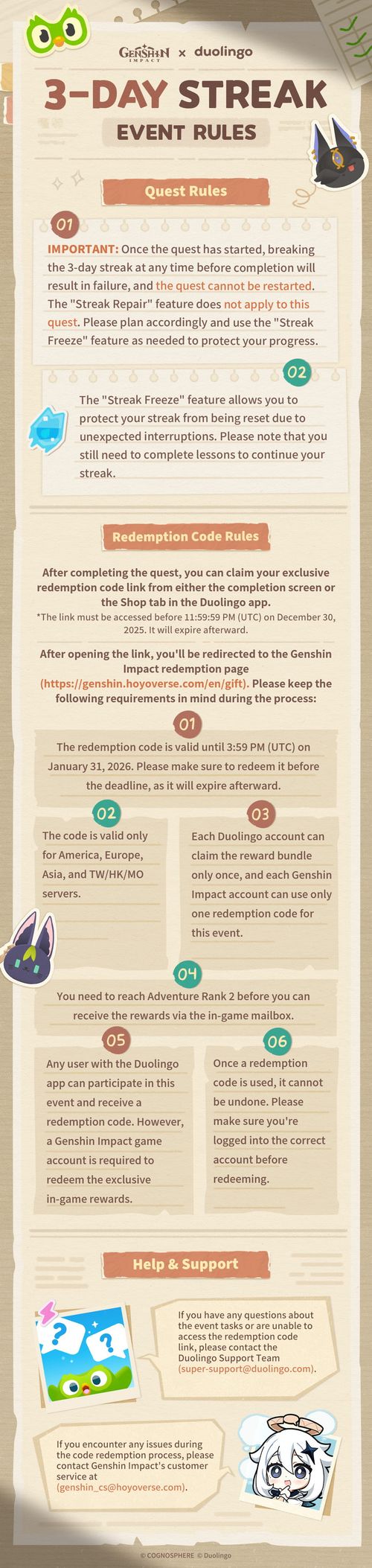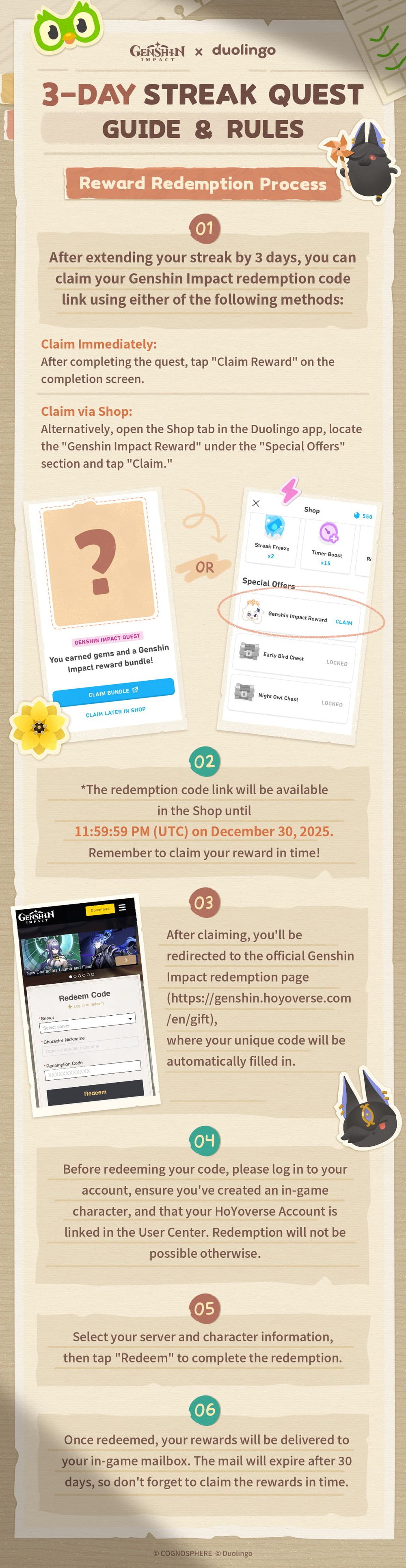 这是多邻国与《原神》的惊喜联动!快来与多儿(Duo)以及他的好友派蒙、提纳里、赛诺一起完成特别任务吧。从 2025 年 12 月 8 日 上午 8:00 起,到 12 月 28 日上午 7:59(对应 UTC 时间 2025 年 12 月 8 日 00:00~2025 年 12 月 27 日 23:59),连续 3 天保持你的连胜纪录,即可获得独家多邻国主题《原神》奖励包。