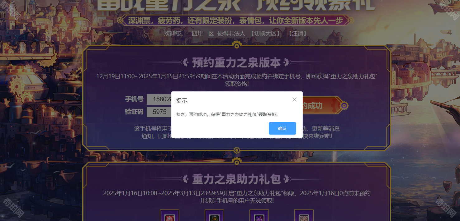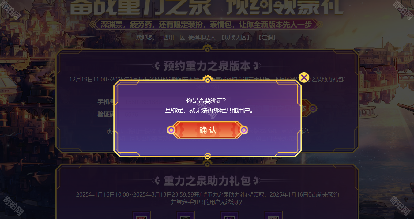 在活动页面完成预约并绑定手机号,即可获得"重力之泉助力礼包"领取资格