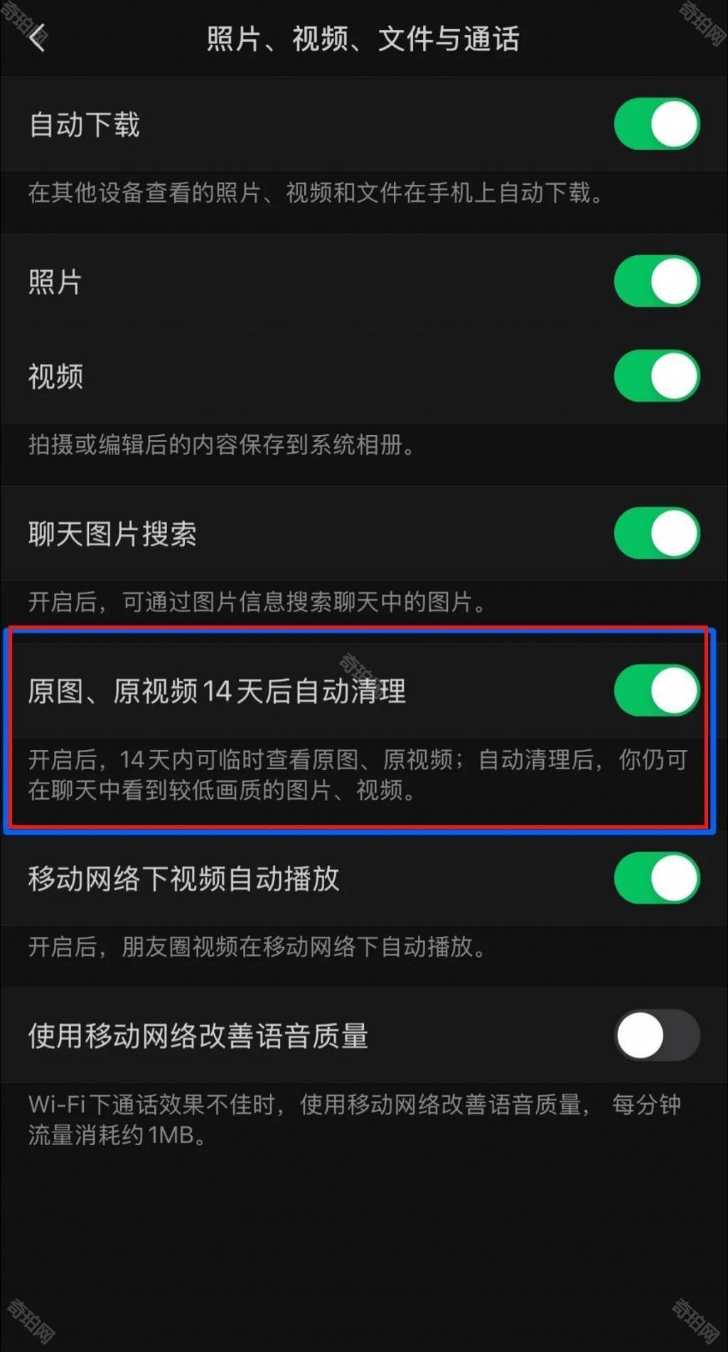 4、将原图、原视频14天后自动清理功能开启即可