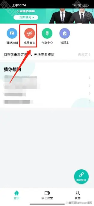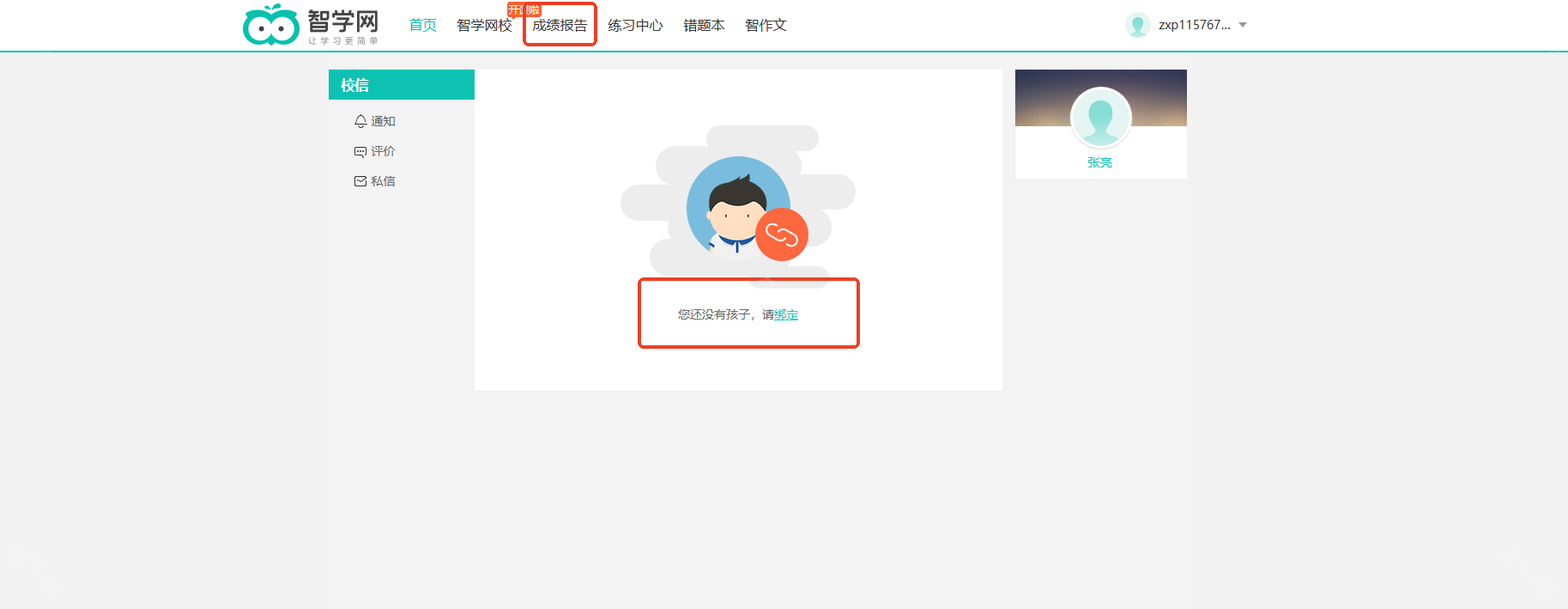 3、点击顶部的成绩报告,绑定孩子后即可查看成绩