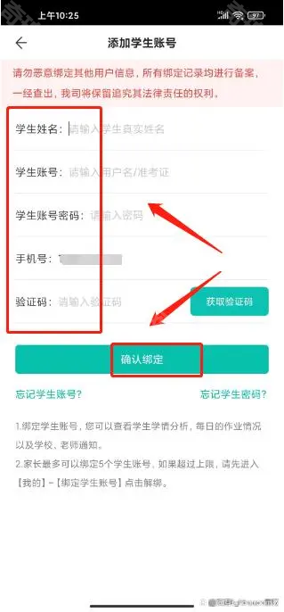 2、这是会提示我们添加学生账号,填写完信息后点击确认绑定