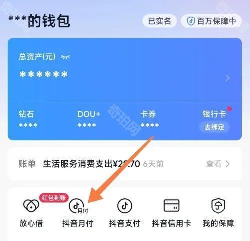 1、打开抖音APP,进入我的钱包,找到抖音月付