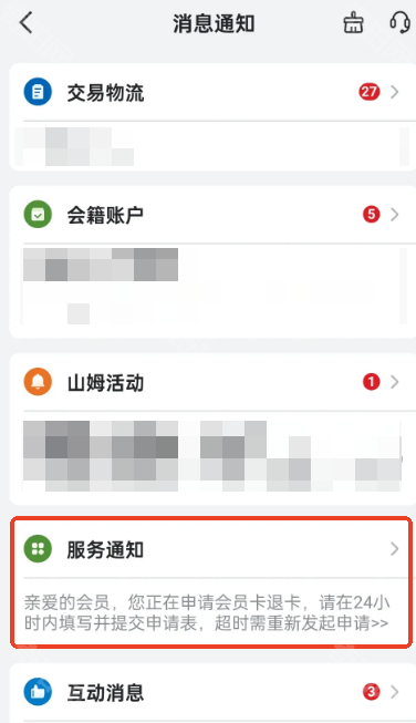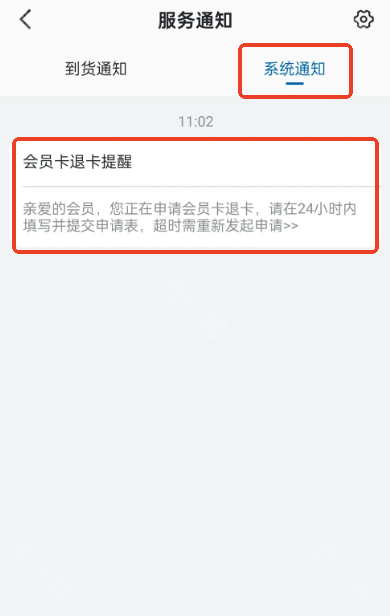 7、前往消息通知,在服务通知中的系统通知找到会员卡退卡提醒