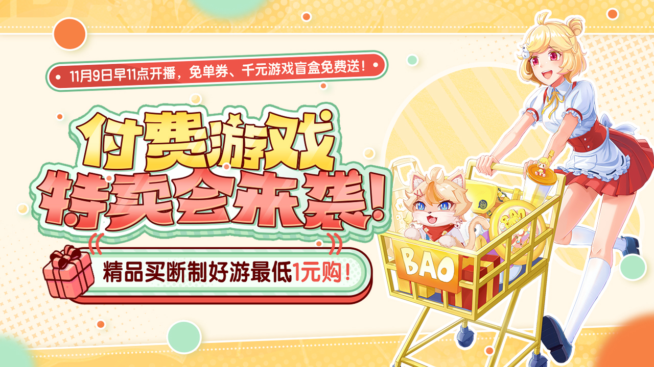 直播介绍: 玩这么大?「快爆付费游戏特卖会」将于11月9日上午11点开启,直播期间将有多款游戏开启限时史低特惠(最低1元购),观看直播还将抽取1000元游戏盲盒、游戏免单券、京东卡、苍翼:混沌效应Steam版激活码免费送!