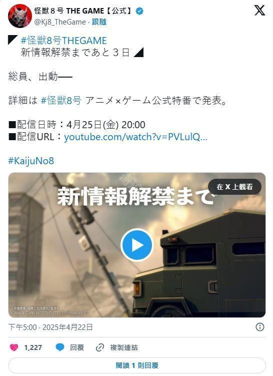 此外,为迎接本次的特别节目,《怪兽 8 号 THE GAME》官方 X 目前正每天公开一支倒数影片。播出当天《怪兽 8 号 THE GAME》官方 X 也会与节目一同公布游戏最新资讯。