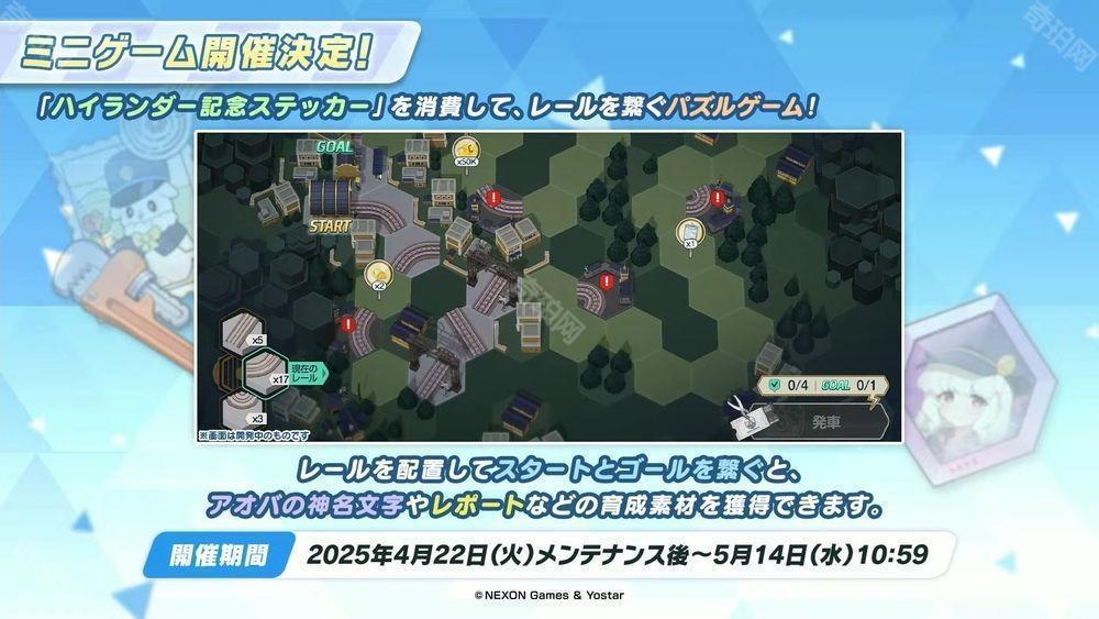 另外,消耗「高地人纪念贴纸」可游玩连接铁轨的迷你游戏。连接铁轨的起点与终点,即可获得「青叶的神名文字」与「技术笔记」等养成素材。