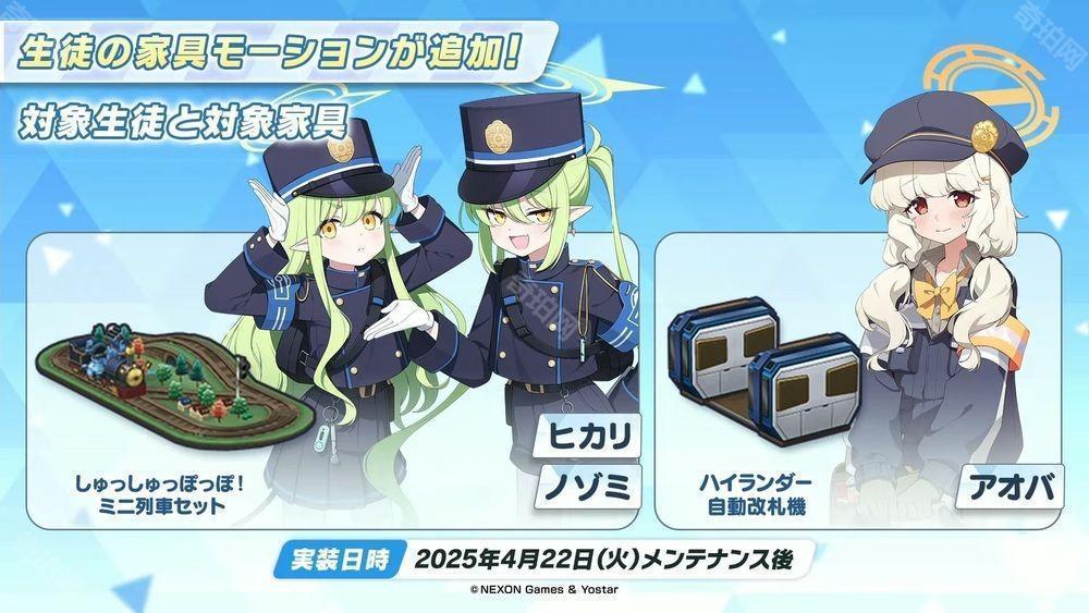 此外,「光」与「希望」的动作对应家具「咻咻噗噗!迷你列车组」、「青叶」的动作对应家具「高地人自动剪票机」、以及全新家具系列「高地人列车」,将同时于 4 月 22 日(二)维护后登场。