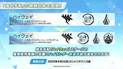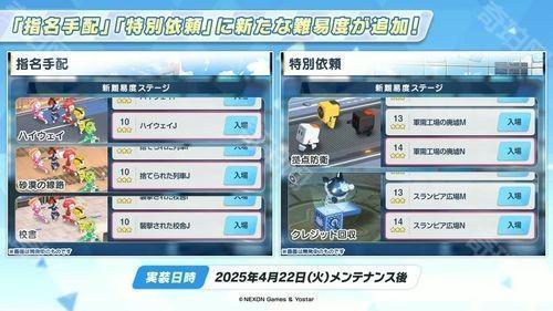 4 月 22 日(二)维护后,悬赏通缉「高速公路」关卡的预计获得报酬学园将追加「高地人铁道学园」。「悬赏通缉」、「特殊任务」将同时追加新难度。