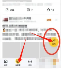 1、首先打开懂车帝,点击下方菜单栏的“车友圈”,点击“发布”。